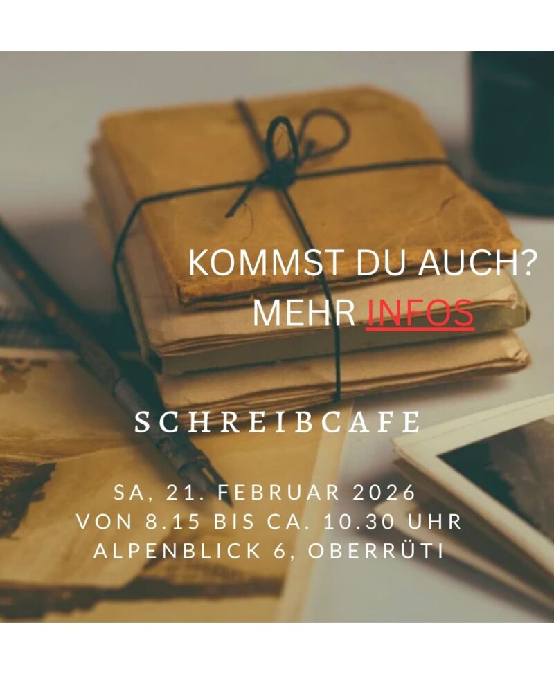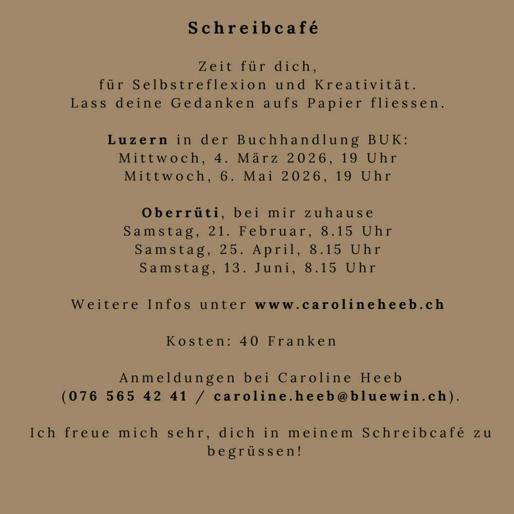 Maximale Teilnehmerzahl: 10 Personen. Anmeldungen nehme ich gerne unter 076 565 42 41 oder caroline.heeb@bluewin.ch entgegen. Ich freue mich sehr, dich in meinem Schreibcafé zu begrüssen! Für weitere Informationen zum Schreibcafé darfst du mich gerne kontaktieren: